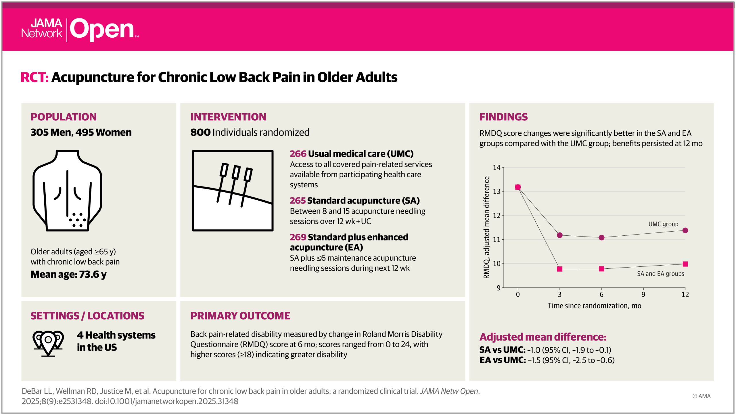 DeBar LL, Wellman RD, Justice M, et al. Acupuncture for Chronic Low Back Pain in Older Adults: A Randomized Clinical Trial. JAMA Netw Open. 2025;8(9):e2531348. doi:10.1001/jamanetworkopen.2025.31348.